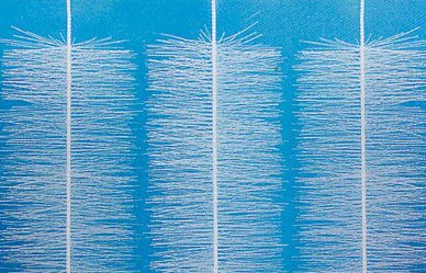 彈性立體填料篩選了聚烯烴類和聚酰胺中的幾種耐腐、耐溫、耐老化的優(yōu)質(zhì)品種,混合以親水、吸附、抗熱氧等助劑,采用特殊的拉絲,絲條制毛工藝,將絲條穿插固著在耐腐、高強度的中心繩上,由于選材和工藝配方精良,剛?cè)徇m度,使絲條呈立體均勻排列輻射狀態(tài),制成了懸掛式立體彈性填料的單體,填料在有效區(qū)域內(nèi)能立體全方位均勻舒展?jié)M布,使氣、水、生物膜得到充分混滲接觸交換,生物膜不僅能均勻的著床在每一根絲條上,保持良好的活性和空隙可變性,而且能在運行過程中獲得愈來愈大的比表面積,又能進行良好的新陳代謝,這一特征與現(xiàn)象是國內(nèi)目前其他填料不可比擬的。